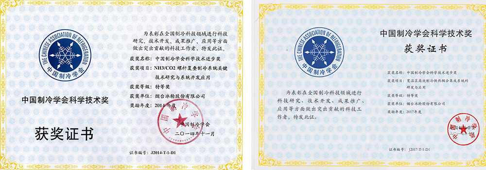 2014年-2017年,NH3/CO2螺杆复叠制冷技术与宽温区冷热耦合系统技术先后荣获中国制冷学会科技进步特等奖。