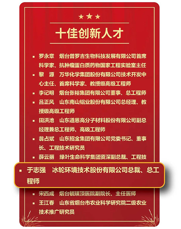 于志强此次获得“十佳创新人才”称号,说明冰轮环境的技术创新以及为推动社会经济发展和烟台人才事业发展作出的突出贡献得到了烟台市的高度肯定,冰轮环境将继续发挥自身优势,推动冰轮事业持续稳健发展,同时为加快烟台市乃至山东省新旧动能转换做出积极贡献,创造更多的经济效益和社会效益。