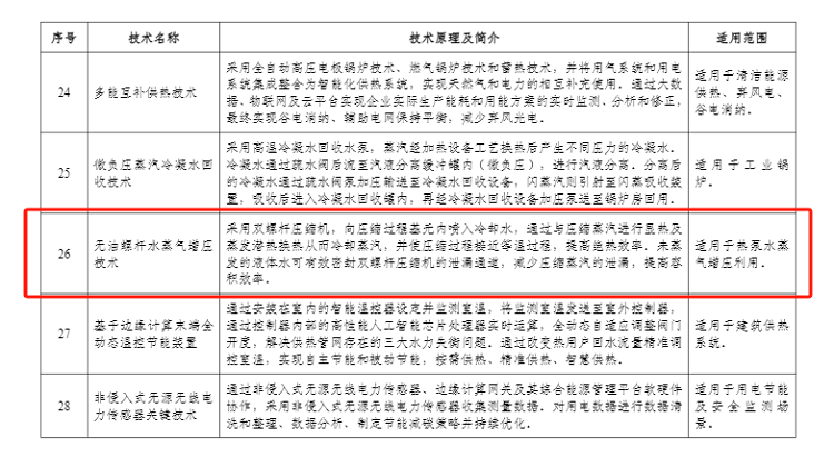 为贯彻落实《“十四五”工业绿色发展规划》,加快推广应用先进适用节能技术装备产品,促进企业节能减碳、降本增效,推动工业和信息化领域能效提升,近日,工业和信息化部发布了《国家工业和信息化领域节能降碳技术装备推荐目录(2024年版)》公示,冰轮环境无油螺杆水蒸气增压技术成功入选。