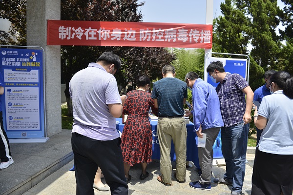 中国制冷学会·科学普及网 6月15日讯 6月11日,冰轮集团作为中国制冷学会科普及教育基地组织开展“制冷在你身边 防控病毒传播”主题活动,冰轮环境党委副书记、科普基地主任董大文带领冰轮职工,走进只楚园区分发资料宣传家用空调自助清洗的相关知识。